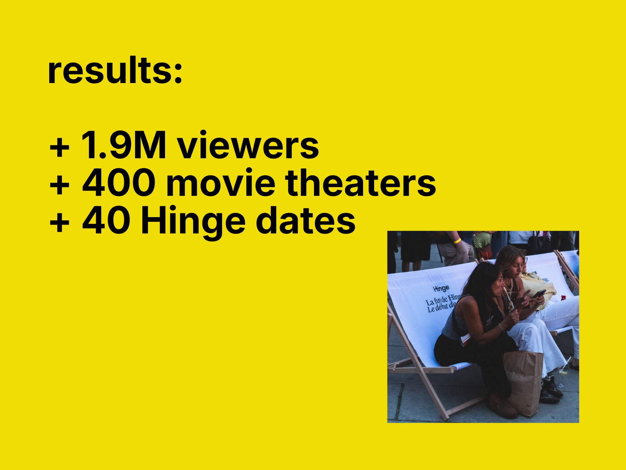 Cinema is the perfect activity for a Hinge date. We designed a national cinema campaign completed with an event activation during the most wanted event in paris: the Cinema Paradiso open air festival in the Louvre. 40 Hinge users were invited to the movie screening for a proper date in the Louvre courtyard.